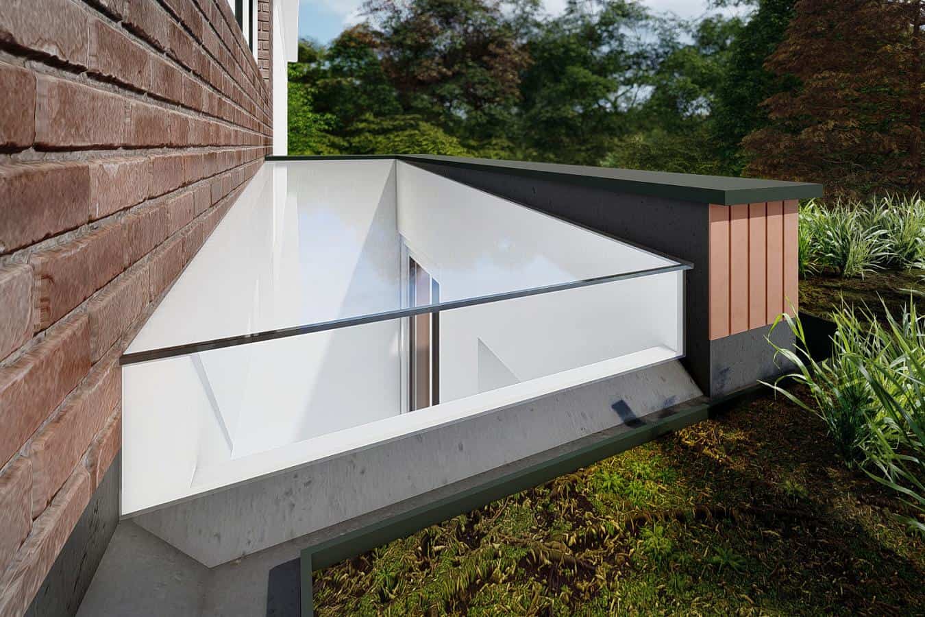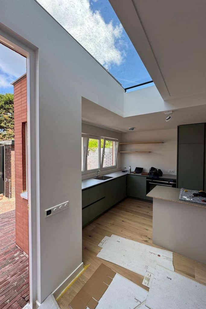 Het gedeelte van de keuken is iets verlaagd, terwijl de achterdeur juist hoog is. Vanuit het interieur is gekozen voor een groot daklicht, die geeft heel veel licht.