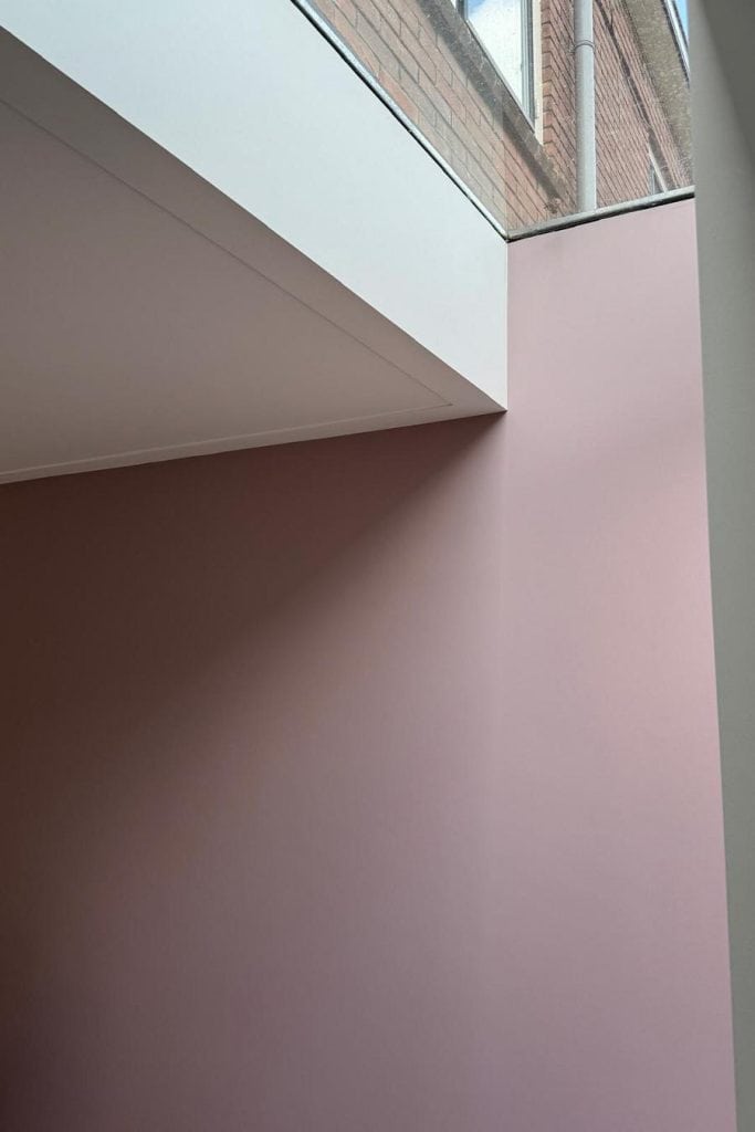 Het interieur is een spel van daglicht en volumes. Het betreft een aanbouw waarbij we de aanbouw modern hebben gehouden en het bestaande gedeelte hebben geaccentueerd door een gestucte plint op het plafond.
