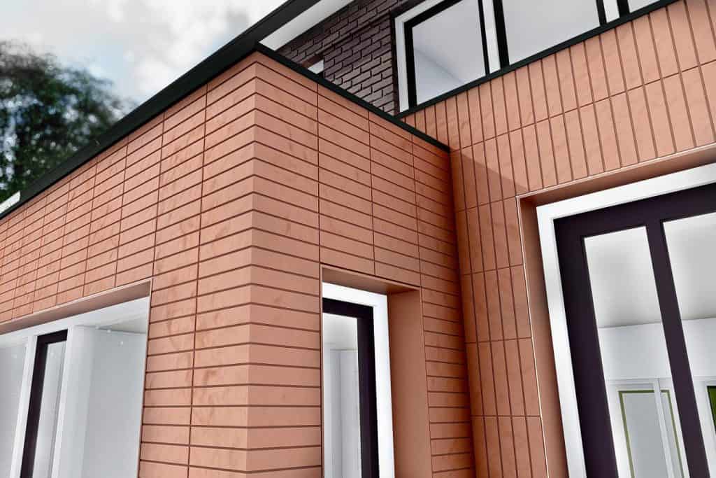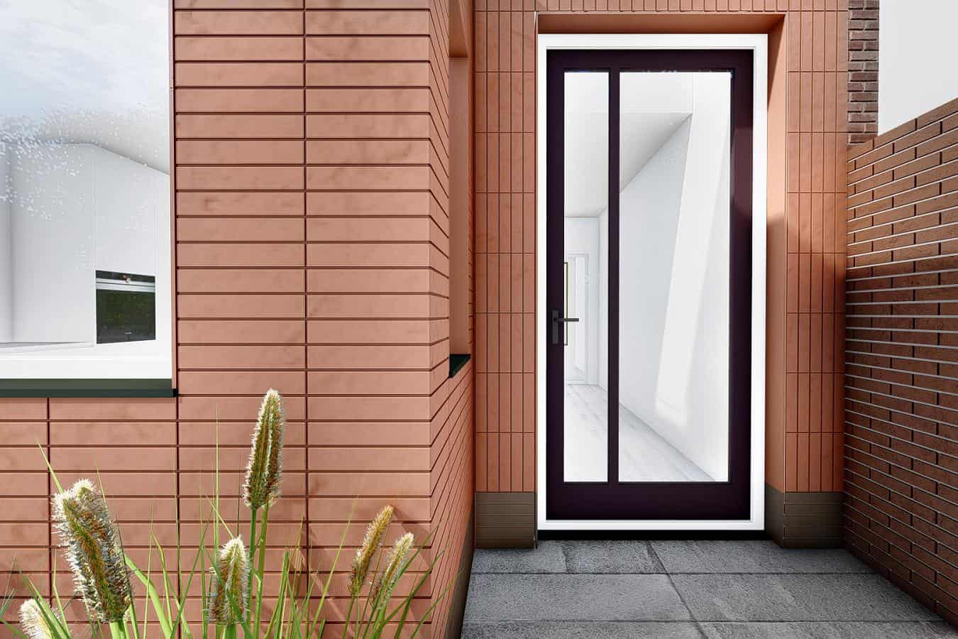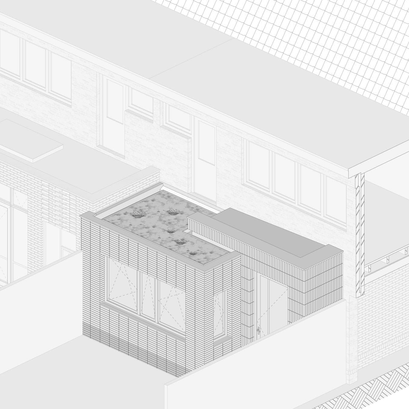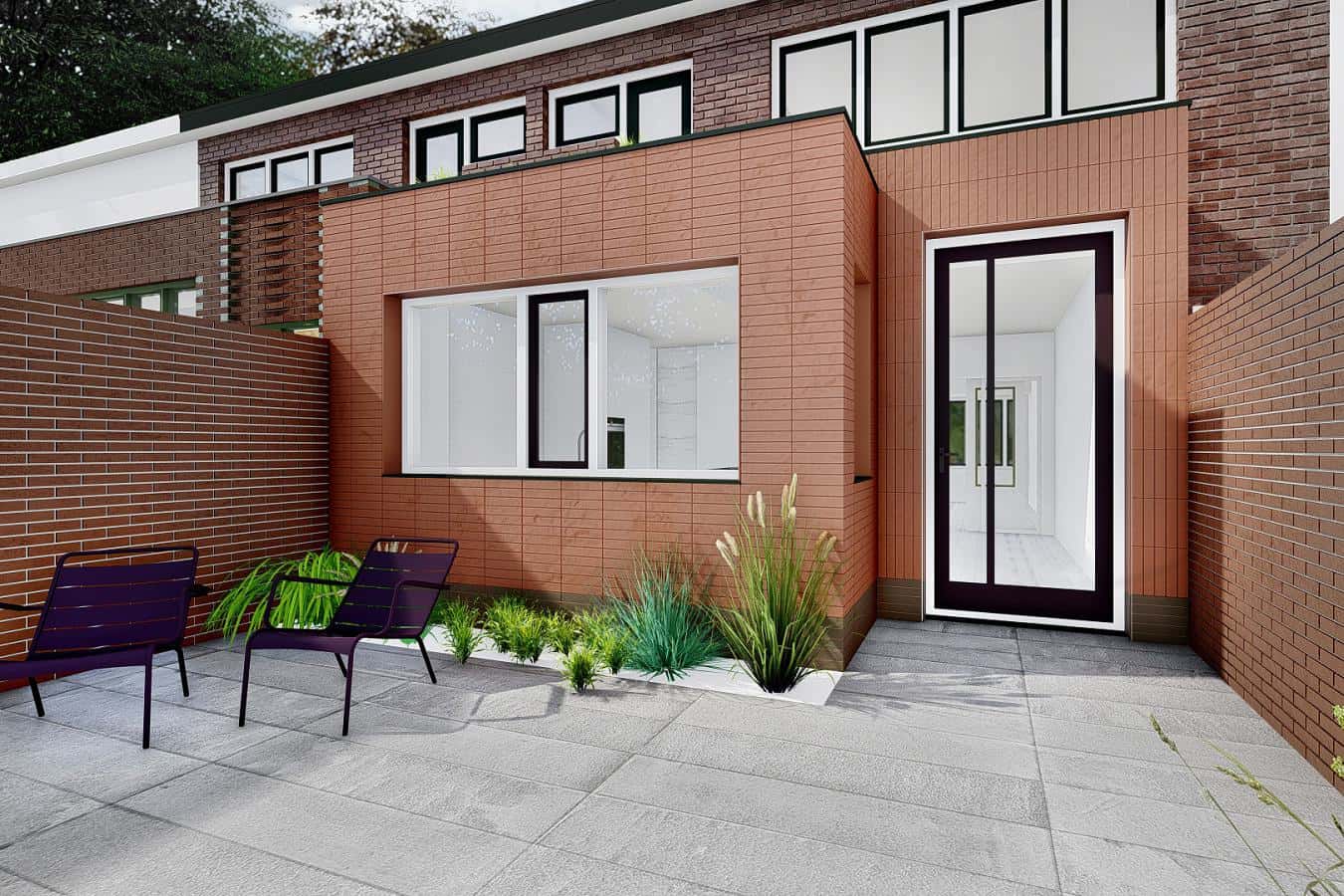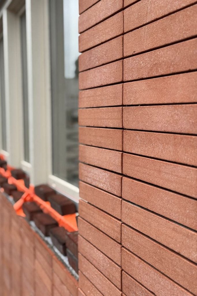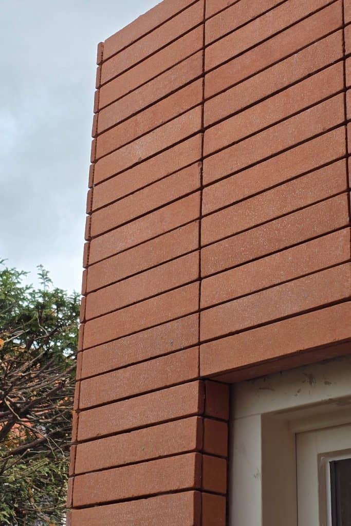 Deze uitbouw combineert moderne toevoegingen met karakteristieke elementen van de bestaande woning. 1 uitbouw met 2 volumes die in elkaar grijpen. Ze worden beide geaccentueerd door verticaal en horizontaal tegelwerk. Elke tegel is met precisie geplaatst, volgens het principe van volledige tegelmaten, zonder snijverlies. Het gebruik van handgemaakte terracotta tegels van David&Goliath, met iets donkerder voegwerk, geeft subtiel diepte en karakter en benadrukt het ambachtelijke detail.